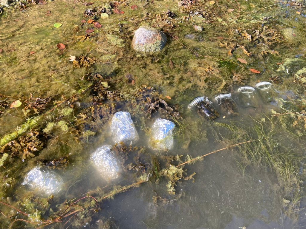Vi delade upp blåstången, som vi färdigt tagit till detta experiment, i fyra olika glasburkar, varav två täcktes med folie så att inget solljus kunde tränga in. Vi fyllde också ytterligare fyra fler glasburkar med bara vatten, där två också täcktes med folie. Då hade vi åtta burkar sammanlagt, som vi sedan skulle placera ut på ett grunt ställe i havet nära kusten. När allt var klart gick vi och åt lunch.