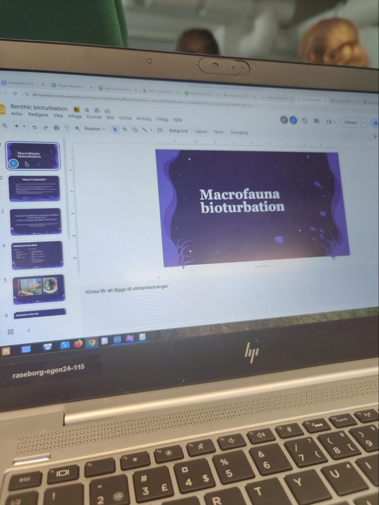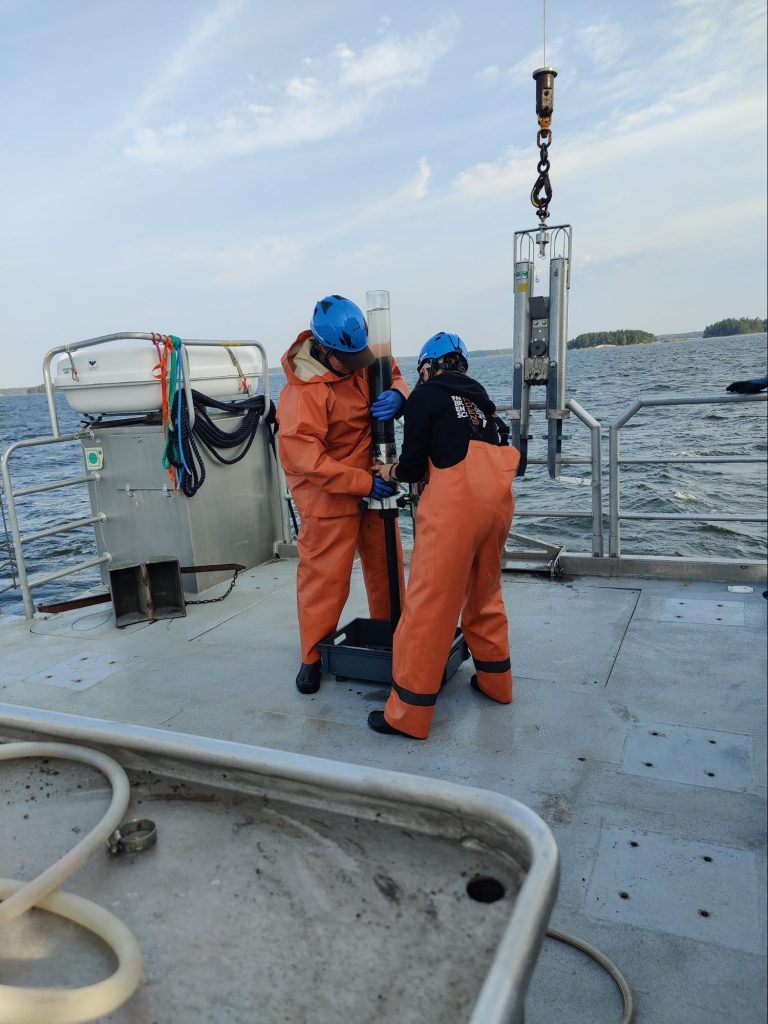 Vi blev förda med fartyget till platsen där vi skulle ta våra prover. Först tog vi tre mindre prover, där vi mätte temperaturen och syrehalten vid havsbottnen och siktdjupet, alltså hur långt ner i vattnet man kunde se. Sedan var det dags för det häftigaste provet, vi skulle ta upp sediment från havsbottnen. Detta gjordes med hjälp av ett större provtagningsverktyg. Det var ändå experterna som använde det här större provtagningsverktyget, inte vi studerande.
