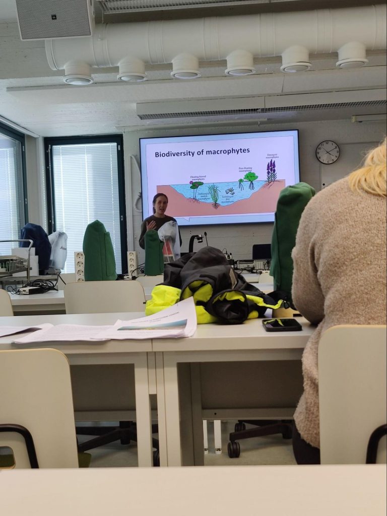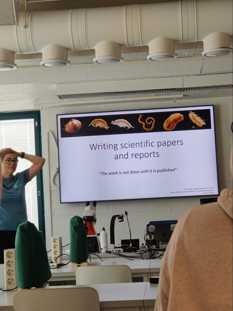 Kursen inleddes med flera intressanta och lärorika presentationer. Den första presentationen handlade om Tvärminne zoologiska stations historia och dess nuvarande verksamhet, medan den andra presentationen var mer teoretisk och gav oss en introduktion till biologisk mångfald och hur ekosystem fungerar. Därefter höll en av stationens dykare den tredje presentationen, där hon berättade om sitt liv som dykare. Den fjärde och sista presentationen hölls av en av stationens forskare som berättade om sin forskningskarriär och sin roll på stationen. Efter alla presentationer blev vi studerande uppdelade i fyra olika grupper och vi fick veta vad för tema våra slutpresentationer skulle handla om på fredagen. Grupperna skulle göra samma experiment på fyra olika vikar. Därefter skulle grupperna presentera ett enskilt experiment vi alla gjorde och jämföra resultaten från de fyra olika vikarna. Efter allt detta var det lunch på stationen.