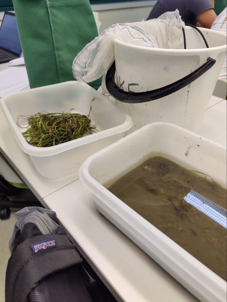 Med flytvästarna på körde vi iväg med båten för att utföra vårt andra experiment. Experimentet gick ut på att mäta hur mycket kol som lagras i makrofyter genom att titta på deras artsammansättning, täckning och biomassa. Under det här experimentet fungerade jag som sekreterare för min grupp, medan mina gruppmedlemmar skötte om den praktiska delen. Vi tog också med oss blåstång från havet som vi behövde för vårt kommande tredje experiment. När vi var klara körde vi tillbaka till stationen för att påbörja det tredje experimentet.