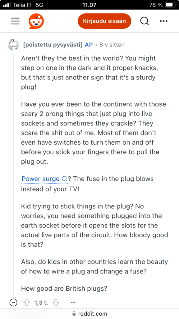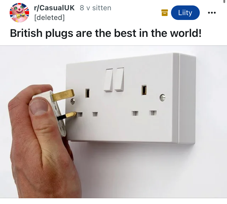 På Brittiska öarna används egna uttag, som britterna anser att vara bäst i världen, men som stolt kontinentaleuropé har jag svårt att hålla med, eftersom det inte går att sätta sladden i uttaget uppochner här. Britterna måste dessutom trycka på en knapp för att få uttaget att fungera. Resande skulle vara mycket enklare utan att behöva adapter.