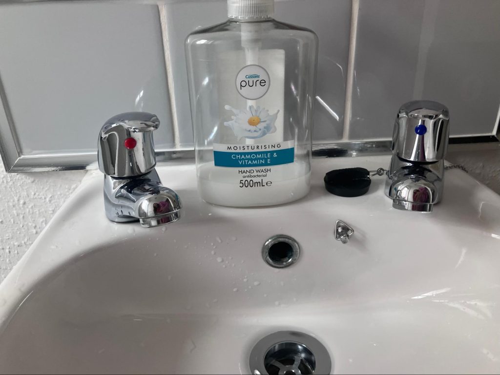I brittiska badrum är det vanligt att man fortfarande har två kranar; en för varmt vatten och en för kallt vatten. Min teknik att överleva badrummet i bostaden i Wales var att använda den heta kranen och den kalla kranen lite, bara om den heta är för het. Men nuförtiden blir det också vanligare med lavoarer med bara en kran, som i resten av världen.